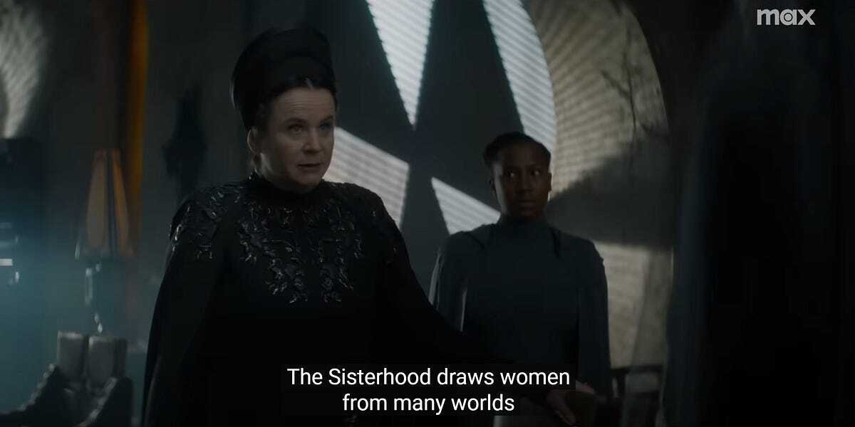 In the trailer, there's no mention of the Bene Gesserit - the group is consistently referred to simply as "the Sisterhood." This is very much in line with the prequel books, where they initially evolve from the Sorceresses of the planet Rossak and only later adopt the name Bene Gesserit. In fact, it's one of our main characters, Valya Harkonnen (shown below), who names the order.